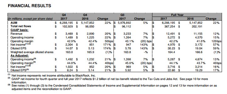 BlackRock, Inc. (NYSE: BLK) today reported financial results for the three months and year ended December 31, 2017.
