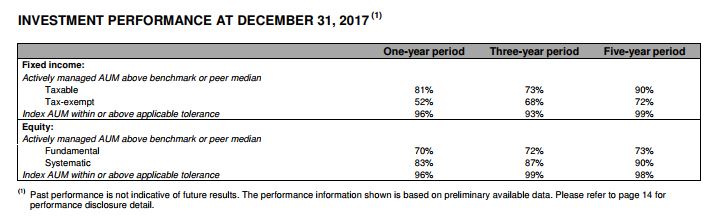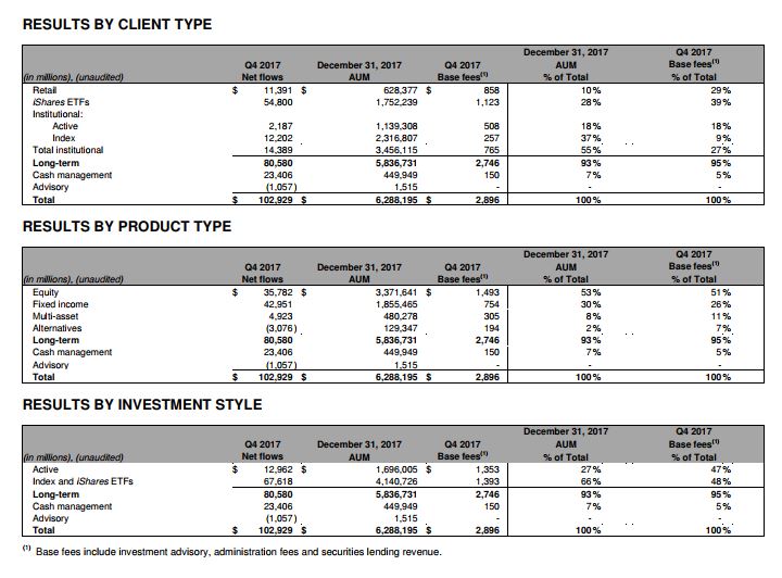 “In alpha-seeking strategies, we are leveraging the powerful combination of human investment expertise and sophisticated data analytics. Performance across our alpha-seeking strategies remains strong and drove $24 billion of net inflows in 2017.